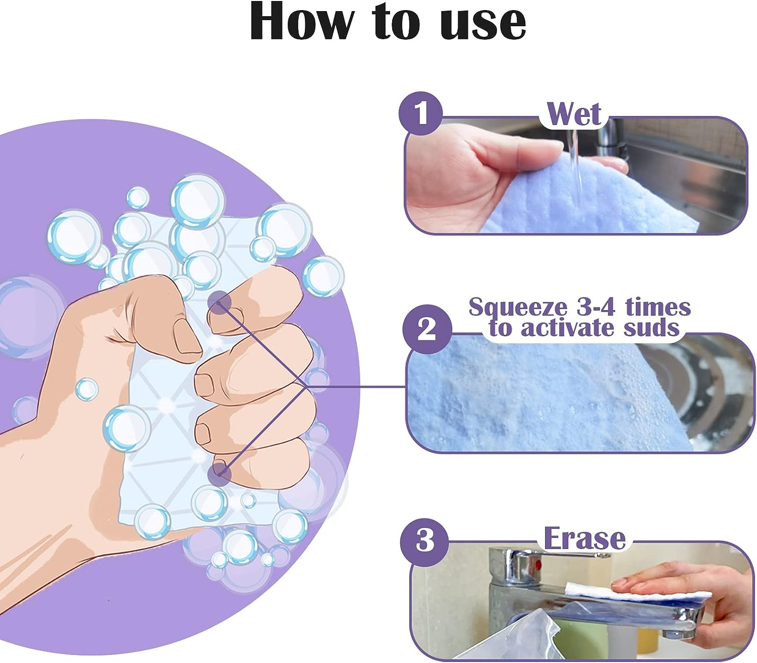 - 【Multiple Effects】Light scrub singles pad with cleaner is composed of scrubbing pads, detergent layer and cleaning surface. No need to buy multiple cumbersome cleaning products, disposable scrubbing pads with cleaner can achieve multiple effects.